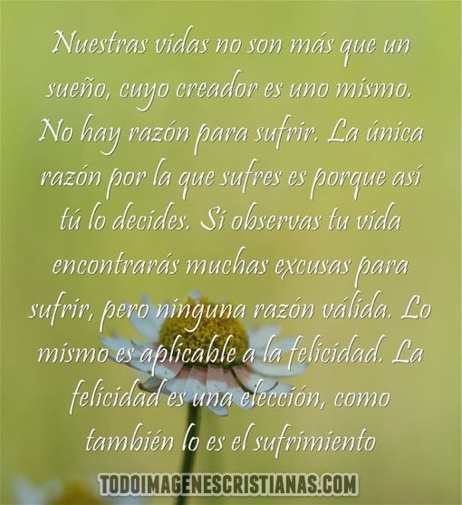Nuestras vidas no son más que un sueño, cuyo creador es uno mismo. No hay razón para sufrir. La única razón por la que sufres es porque así tú lo decides. Si observas tu vida encontrarás muchas excusas para sufrir, pero ninguna razón válida. Lo mismo es aplicable a la felicidad. La felicidad es una elección, como también lo es el sufrimiento.