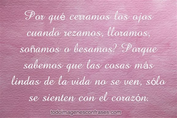 Vivimos en un mundo plagado de apariencias, hoy todos (chicos y grandes) asocian belleza con la belleza física, sin embargo esto es una distorsión sobre lo que es la verdadera belleza.... esta es aquella que se siente en el alma cuando observas o vives algo que te gusta. Es un sentimiento tan profundo y lindo que solo se puede sentir con el corazón, ante la belleza los ojos son ciegos, siempre debemos tantear estas cosas desde el centro del pecho, solo así podremos disfrutar de las cosas como debe ser. Para ejemplificar este tema sobre la belleza, dejamos una frase en imagen muy conocida, pero no por eso menos cierta... dice: Por qué cerramos los ojos cuando rezamos, lloramos, soñamos o besamos? Porque sabemos que las cosas más lindas de la vida no se ven, sólo se sienten con el corazón. Para sentir la belleza con el corazón, entonces, cierra los ojos y déjate llevar... descarga esta preciosa imagen y compártela donde más te guste!.